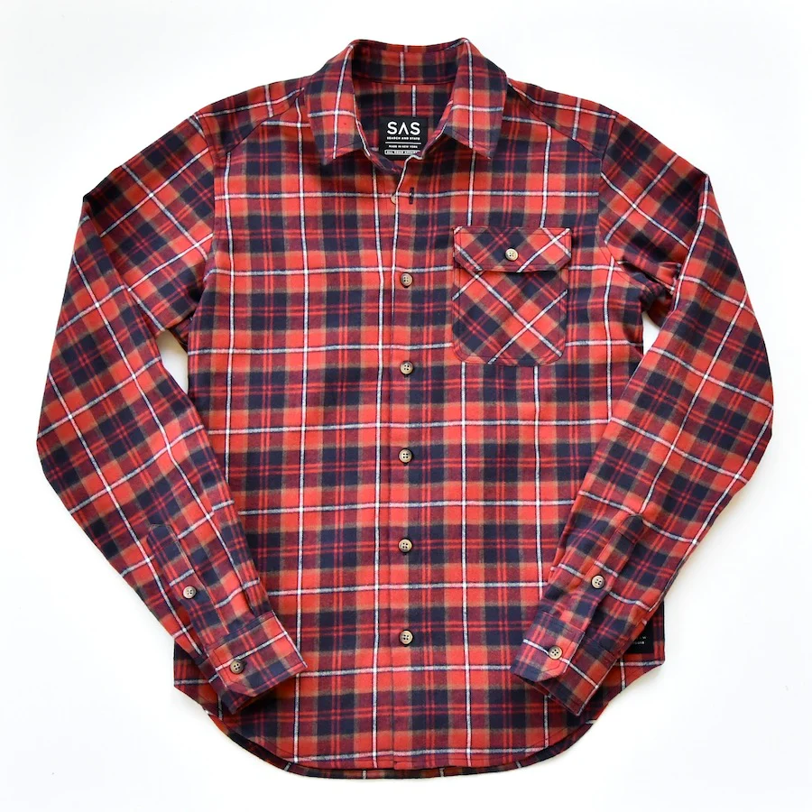 Mid-weight brushed flannel in a rust and cream plaid. Two chest pockets, button-down collar. Made to be worn open over a tee.
